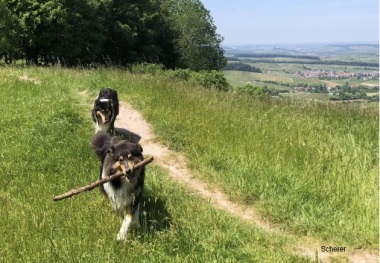 Bei unseren ausgedehnten Spaziergängen auf unterschiedlichen Wegen haben die Hunde überwiegend Freilauf und so Gelegenheit zu spielen und sich auszutoben.