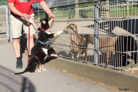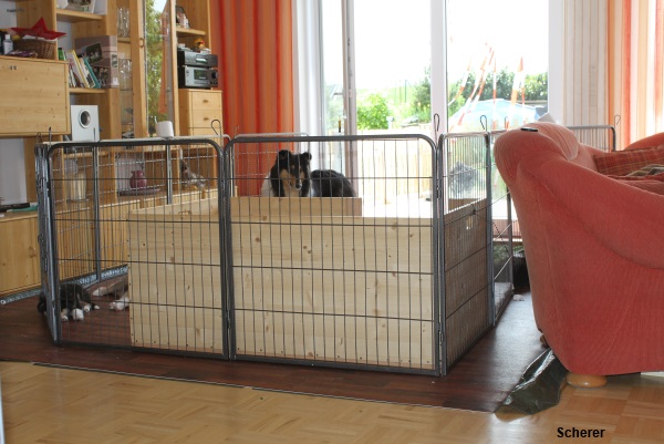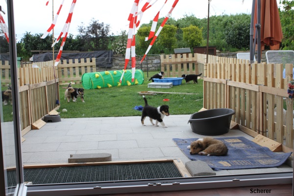 Sobald die Kleinen beginnen die Augen zu öffnen (ca. 12. Lebenstag) ziehen die Welpen in unser Wohnzimmer und verbleiben dort bis zur Abgabe. Sie sind dadurch voll in den Tagesablauf unserer Familie integriert. Zur Erweiterung ihres Aktionsradius steht ihnen unser Garten mit verschiedenen Spielmöglichkeiten zur Verfügung.